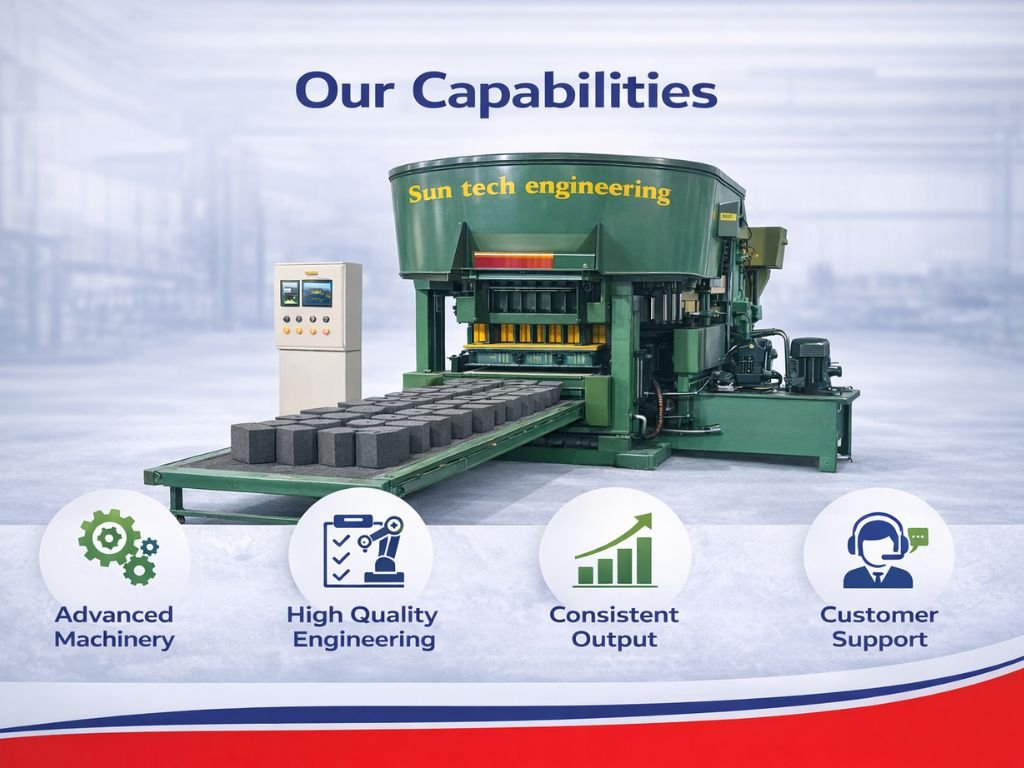 Sun Tech Engineering is a leading manufacturer of brick and block making machines based in Coimbatore. We specialize in Fly Ash Brick, Hollow Block, Paver Block, and Interlock Block Machines designed for high performance and durability. With a strong focus on quality engineering and customer satisfaction, we deliver reliable machinery solutions to the construction industry.